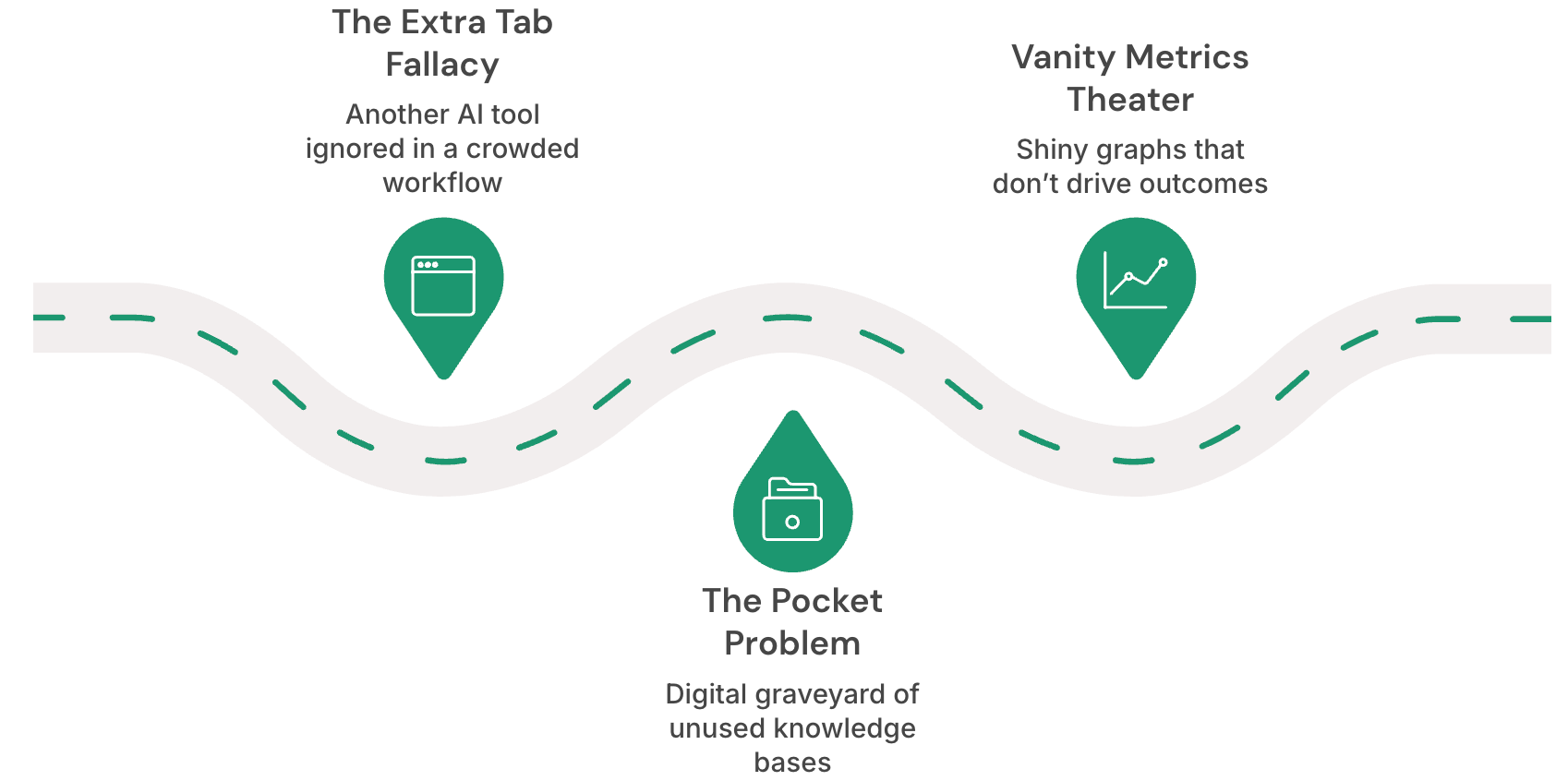 The Pocket Problem. Remember all the excitement around AI knowledge bases and document libraries? They suffered from the same fate as Pocket—that app where you save articles you'll "definitely read later." Teams would dump documents into these AI systems and never come back. Without tight integration into actual workflows, they became expensive digital graveyards.